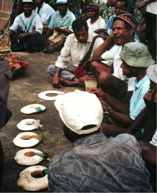 In 1959 Paul Bohannan [1] coined the phrase “spheres of exchange” to refer to moral or legal distinctions made between different types of exchange. Often one set of collectibles was expected to be used in one kind of exchange, and another distinct set in another. Since there are several important kinds of wealth transfer besides exchange, we can generalize Bohannan’s idea to the concept of spheres of transfer. In Western cultures (and many other modern cultures under their influence), for example, we make a strong distinction between money, meant for the rapid turnover of earning and spending, and heirlooms that are expected to stay in the family for generations, with feelings of guilt or shame occurring if we have to sell a family heirloom. But it’s fine to use an heirloom ring for a marriage. Similarly, we make a strong distinction between stocks and bonds on the one hand and decorative wealth objects such as jewelry and artwork on the other. So strong is our taboo that if a Western archaeologist finds a wearable (as in forager days they mostly were) collectible, it is automatically and dogmatically labeled “ornamental” or “symbolic”, with wealth-related uses seldom considered. (It also doesn’t help that shells, often scarce and precious treasures in indigenous environments, look like cheap tourist knick-knacks to modern eyes).