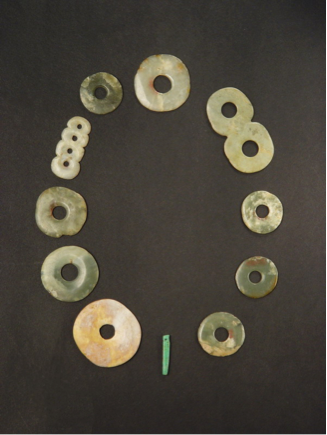 Bronze bells manufactured in China were used to make high-value payments in several parts of the Chinese trading periphery, such as the Philippines. ([3] p84). In the Philippine lowlands, metal luxury goods (kettles, gongs, and jars) as well as gold beads were used for a variety of wealth display and transfer purposes ([2] p265). In China bells were the first objects that were uniquely metallic; other early metal objects such as knives, beads, etc. had been made out of other materials much earlier. Thus the Chinese adopted the word and pictograph of a bell 金 for metal (and even for gold in particular). Metal spades were styled 錢, which, via the spades that became stylized and stamped to invent early coins, became the Chinese term for “money”. [Source]